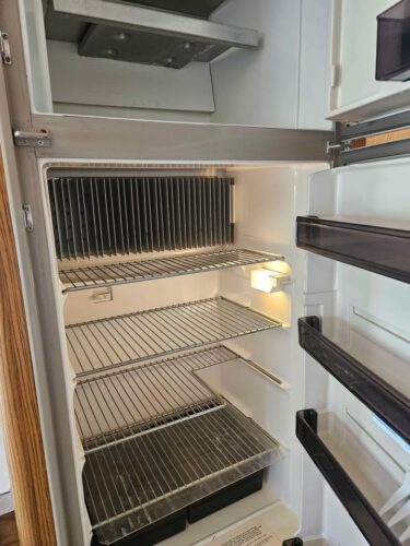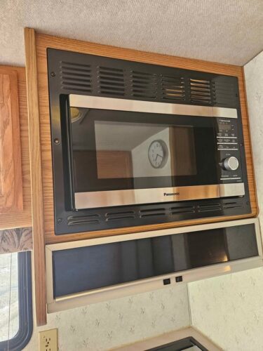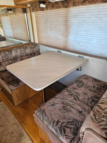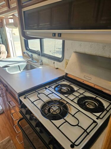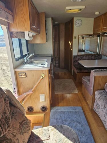 Inside, the layout leans into simplicity—likely original cabinetry and fixtures alongside newer touches underfoot. While modern rigs chase minimalism or sleek finishes, this one holds space for nostalgia: the kind that still smells faintly of coffee brewed in a glass pot and road atlases tucked behind the driver’s seat.