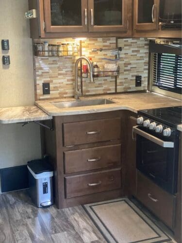 A full kitchen setup with plenty of counter space, modern fixtures, and a backsplash that makes most flats jealous.