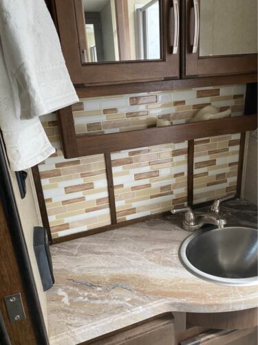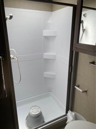 A bathroom that looks like it was designed by someone who’s actually used one on the road — large shower, functional sink layout, no weird angles.