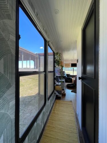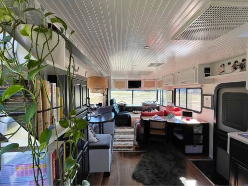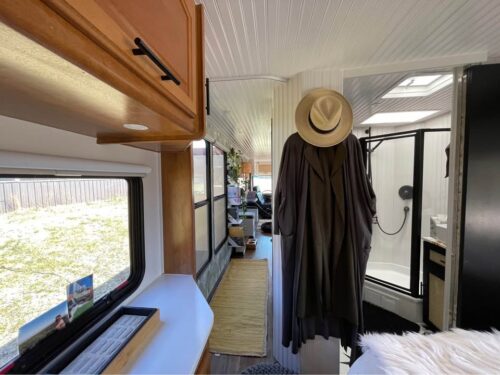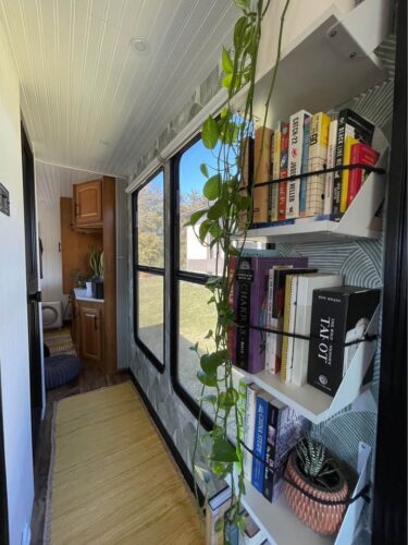 One of the first things you notice is the hallway. A hallway—in an RV. Lined with bookshelves and a vine that trails happily down to a woven rug, this stretch of space feels more like a city apartment than something with wheels. Large windows let in warm light, and the books aren’t just for looks. They’ve clearly been read.