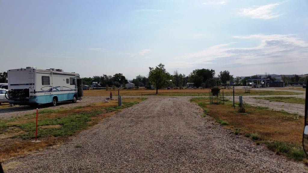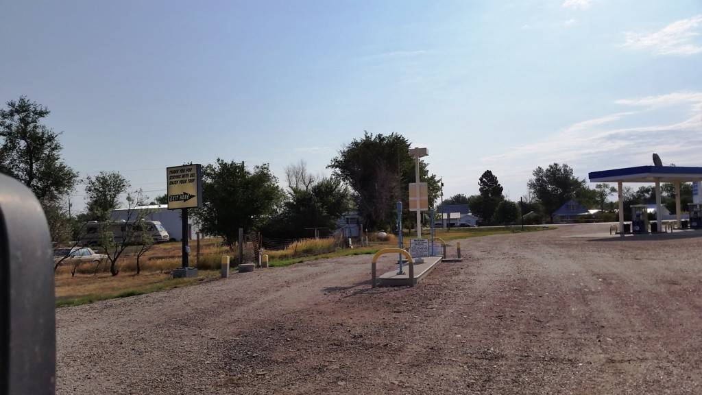 8 Electric hookup 50, 30, 20 amp power pedestals behind a self-service fuel station. There is a dump station available on site and a fresh water fill located at the dump area (no water or sewer at the sites). The lot is packed gravel suitable for overnight stop when cruising down the highway.