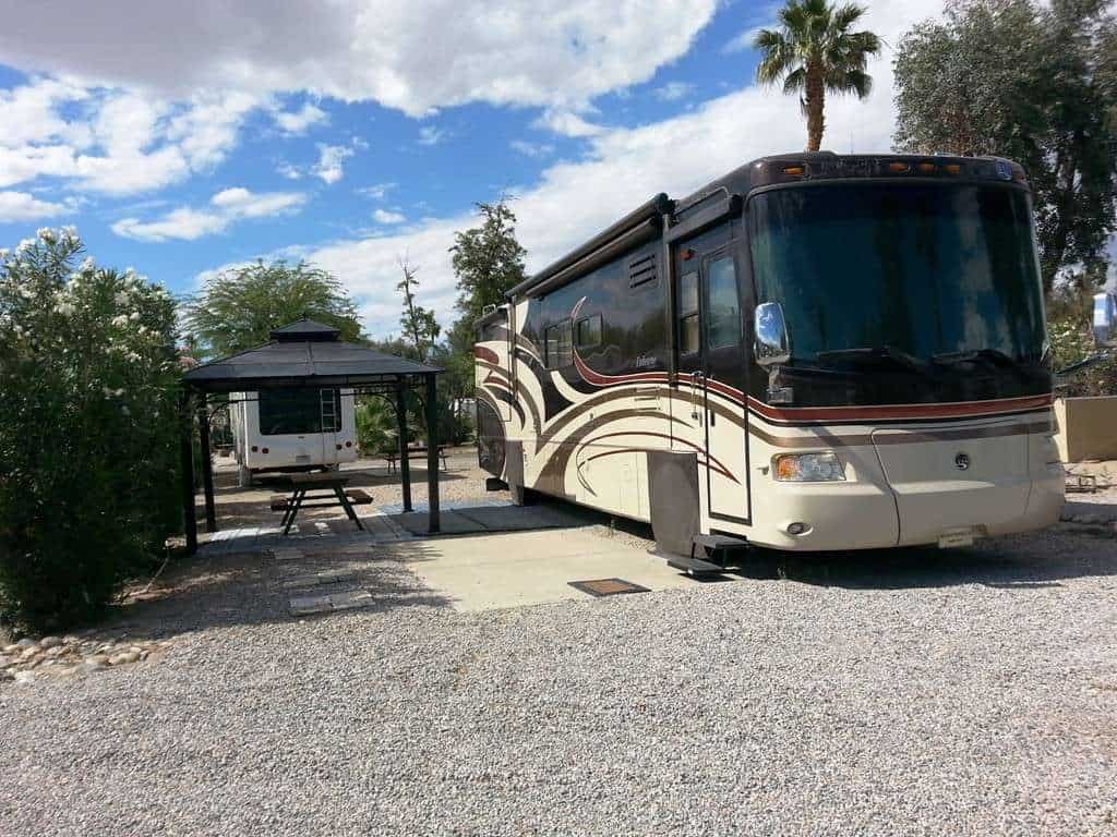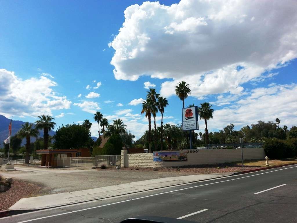 Cathedral Palms Resort in Cathedral City California offers full hookup RV sites for short and long term stays close to the heart of Cathedral City. Roads and pads are packed gravel while most sites have vegetation separators. Facilities are a bit aged but some effort has been made to spruce the place up.