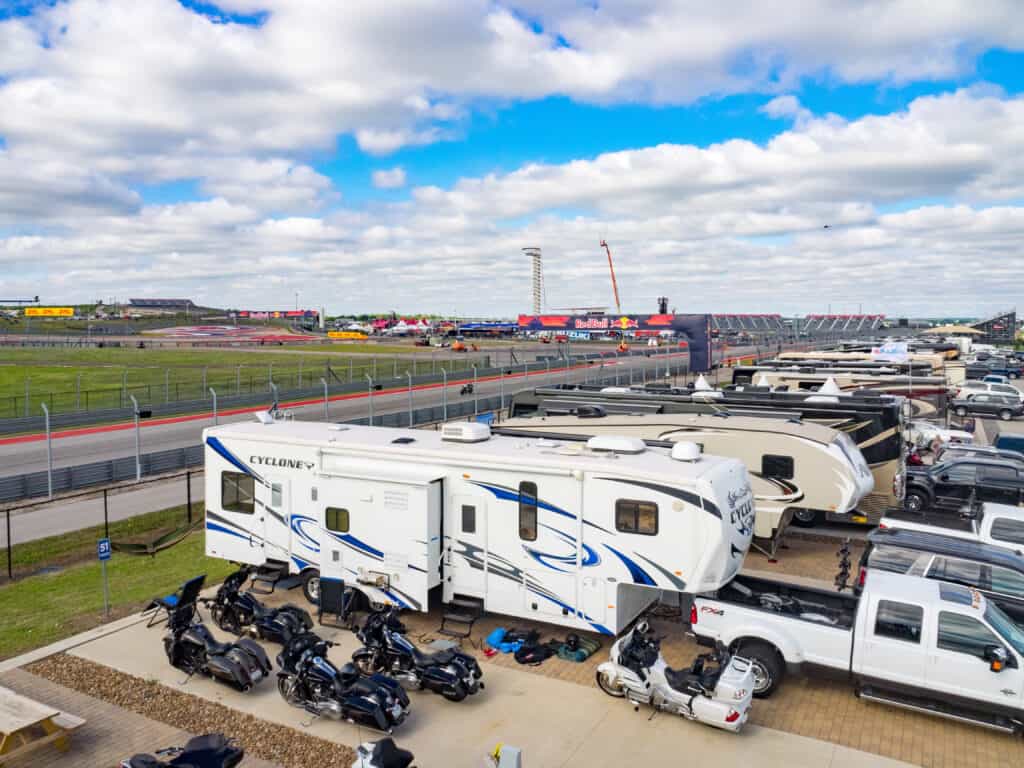 ReV Line RV Park at Circuit of the Americas Raceway in Austin Texas offers full hookup RV sites along the road-coarse style raceway. Open year round the park provides modern services with concrete parking pads, full hookups, a pool, restroom/ shower facilities, laundry and a great view of the raceway. Set in an open setting the [ark can accommodate any sized RV. Online reservations are available.