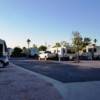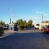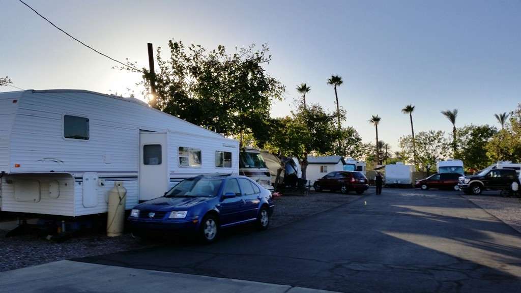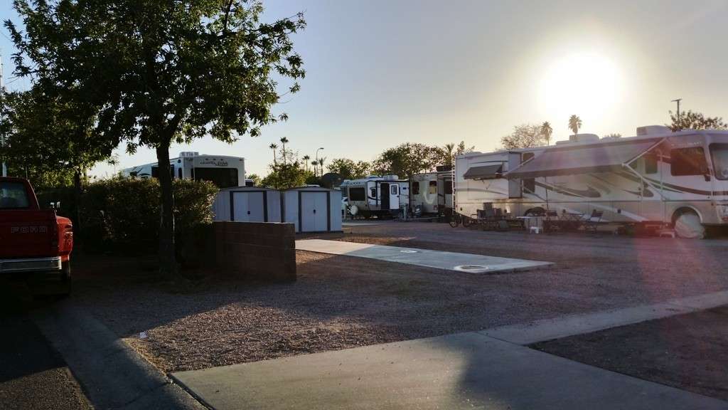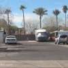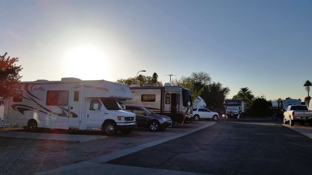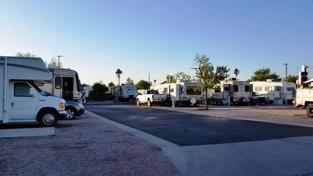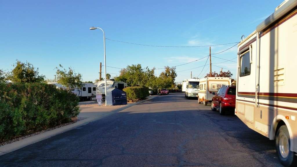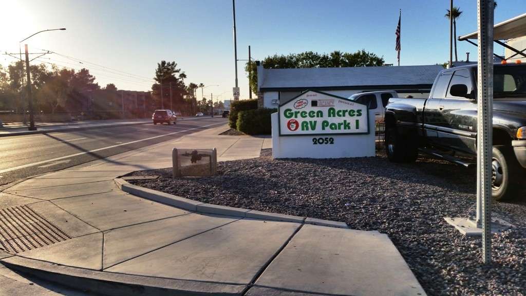 Green Acres RV Park in Mesa Arizona offers 64 back-in full hookup RV sites located in an urban setting adjacent to Main St and a Walgreens. The park caters to long term tenants with a few sites available for short term stays. RV sites are located along two small paved loop roads. The park is better suited to units shorter than 40′ simply because of the volume of vehicles parked all around but does have sites capable of accommodating larger RVs. Sites are on packed gravel and the location is convenient to urban amenities. Situated along the light rail line guests can easily travel in to downtown Phoenix by foot and train.