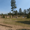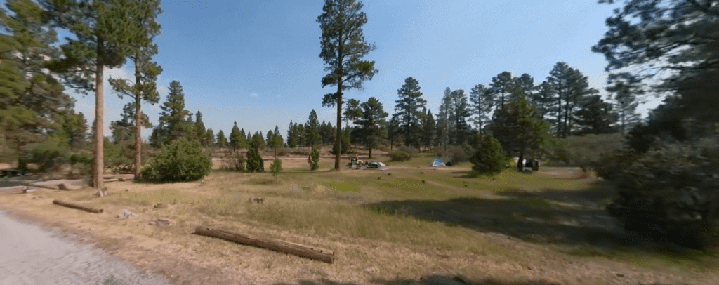 A forest of ponderosa pines towers over Greendale, offering partial shade. Beneath the trees, grasses and plentiful summer wildflowers cover the campground.