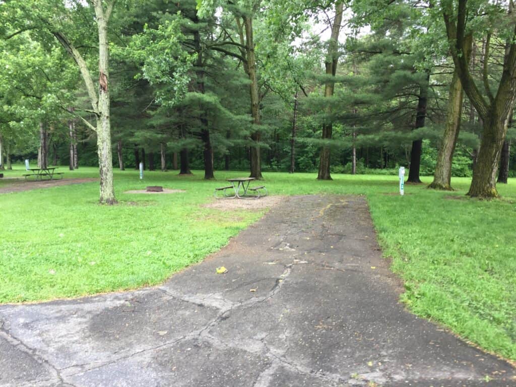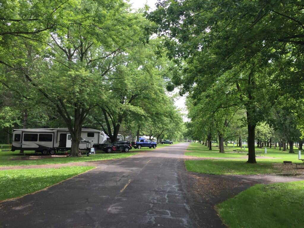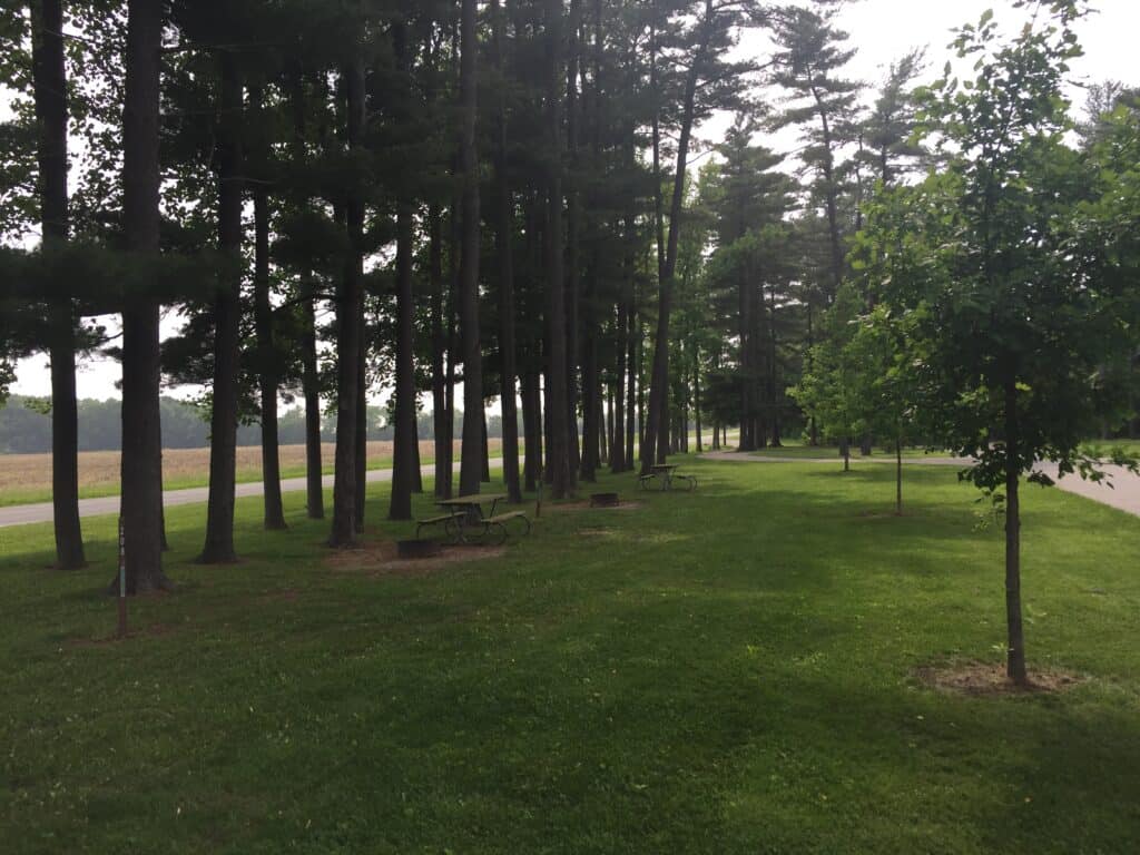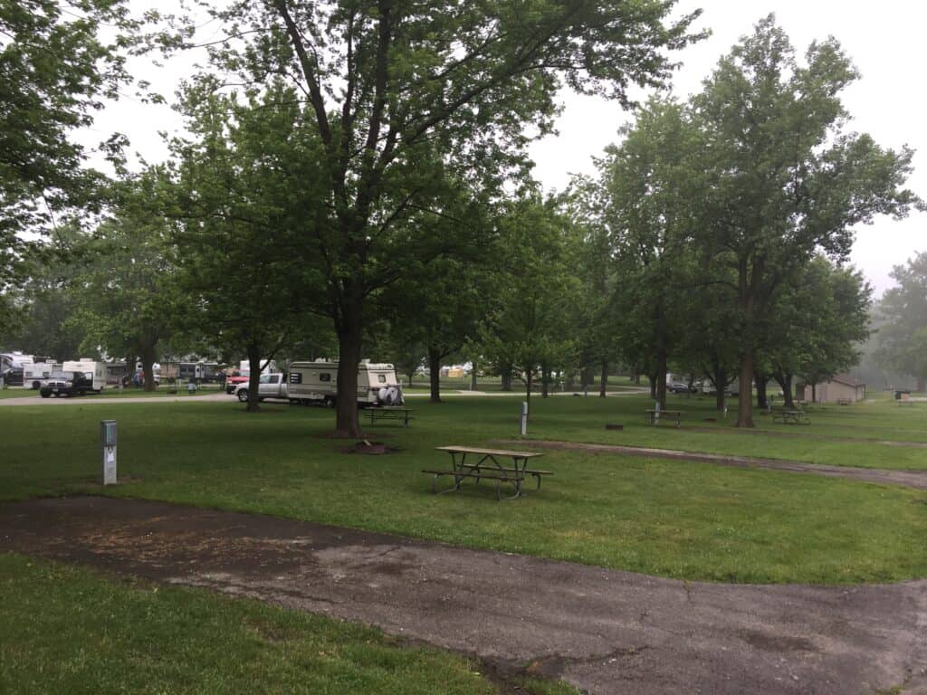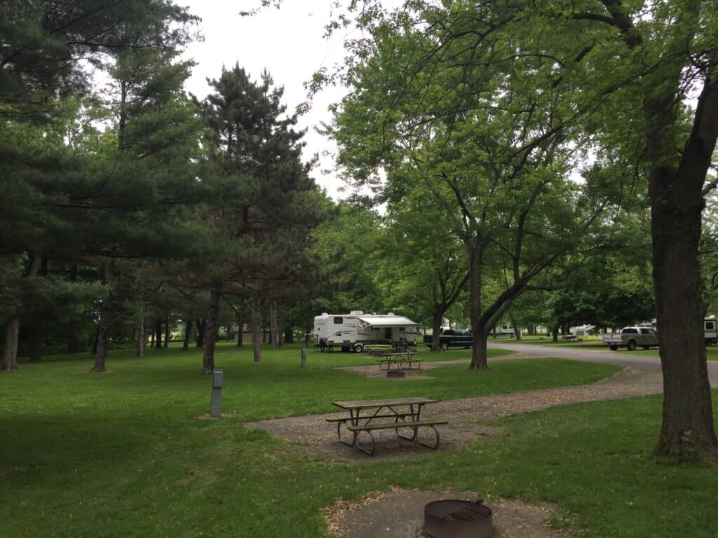 Harrison Lake State Park Campground in Fayette Ohio offers partial and primitive (no water, electric, or sewer) hookup RV and tent camping in a wooded setting adjacent to a recreational lake.
