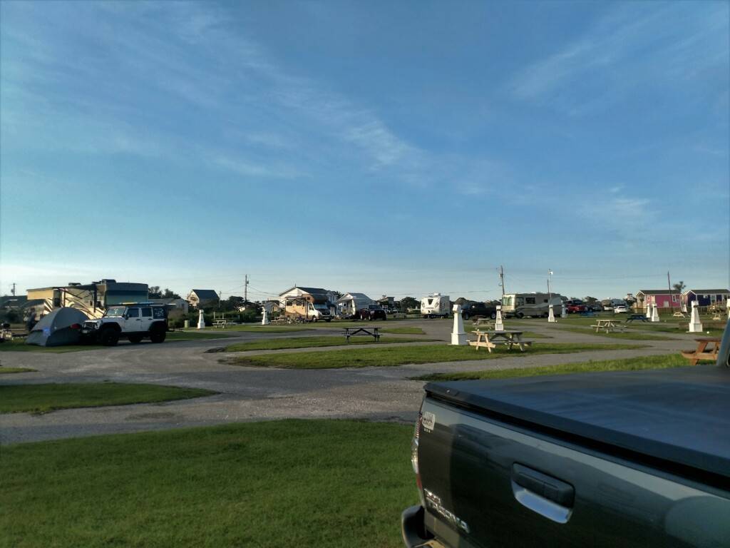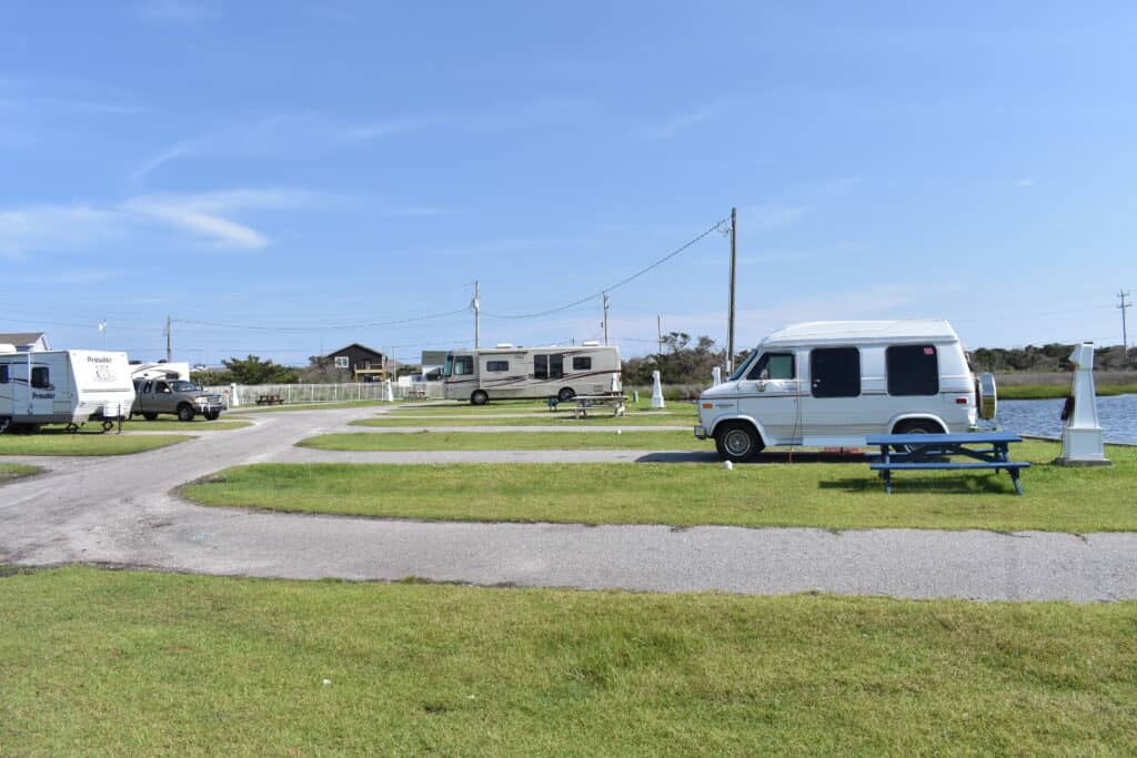 Great campsites convenient to the Hatteras-Okracoke Ferry. Back in to the canal or pull thru the center. 30/50 amp service with full hookups and cable. Swimming pool was clean and refreshing. Bath houses were very clean with ample counter space for toiletry bags, etc. Store on site offered some items you may have missed. Fish cleaning station and canoe/kayak launch within the campground. Close to local restaurants and shopping. They offer cabins and a couple of mobile homes if your traveling with family that need accommodations outside of an RV. Pet friendly, but could use a small dog park. Sites are paved with grass areas around the RV. Will stay here again and highly recommend.