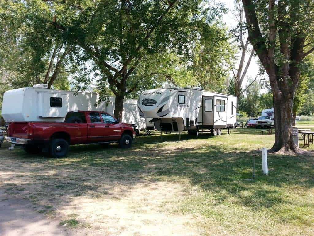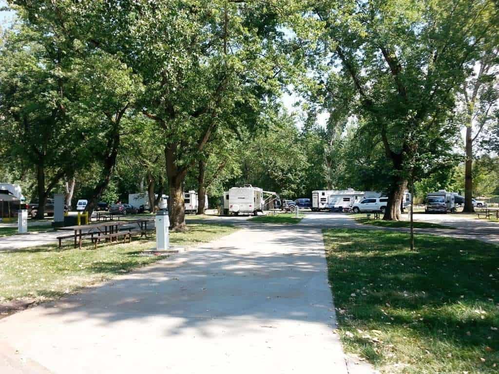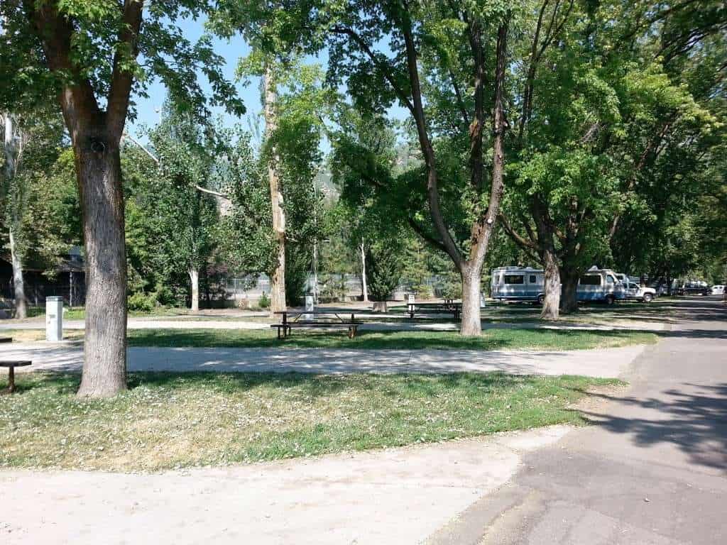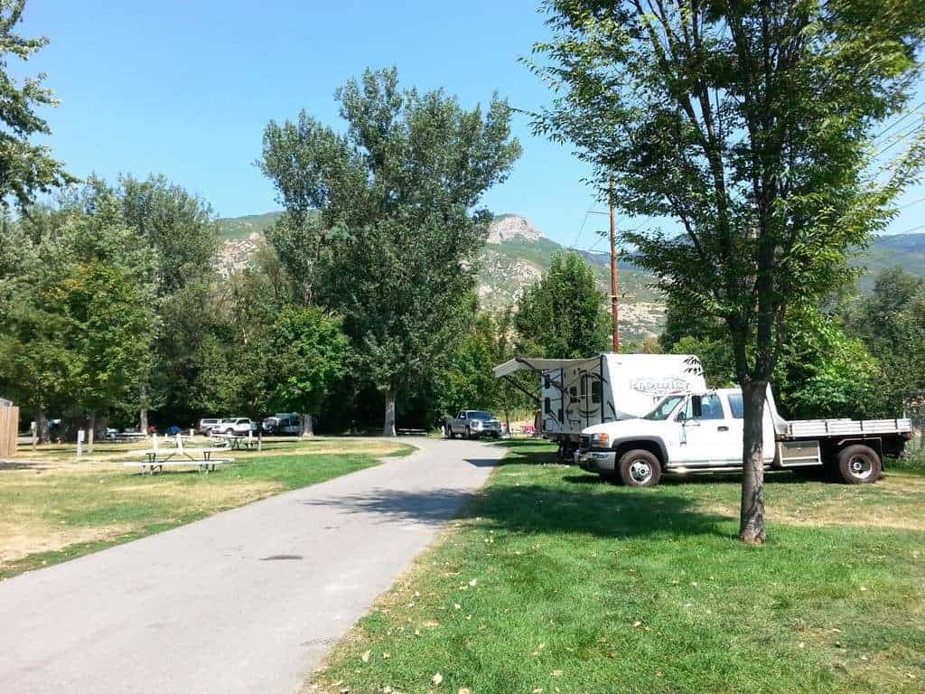 Lagoon Amusement Park Camping in Farmington Utah offers RV and tent camping adjacent to an amusement park. The roads are paved and the sites are mowed grass; except for the large concrete pull thrus with excellent spacing. Large shade trees are located throughout the park. The sites are close together and when crowded can be a bit tight to get in and out of. Located in an urban setting this park is easy to get to. Guests of the campground/ RV park do get discounted access to the amusement park. Sites range from primitive (no hookup) to deluxe full hookup concrete pull thrus. The campground does not provide fire rings but does allow fires if you bring your own pit that stands more than 12″ off the ground.
