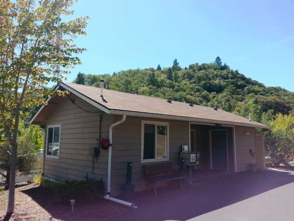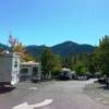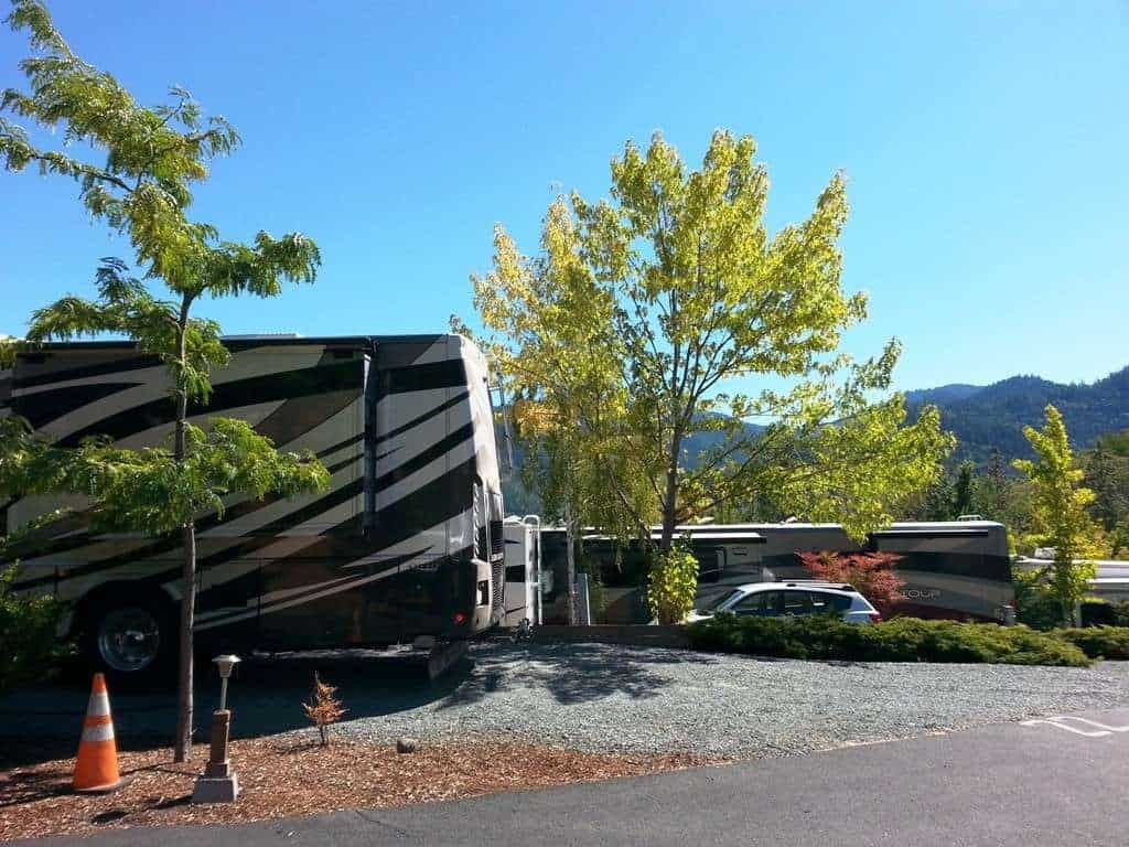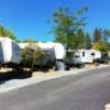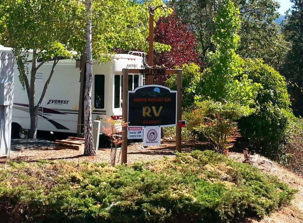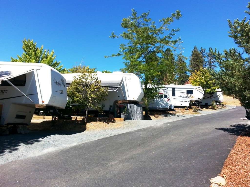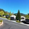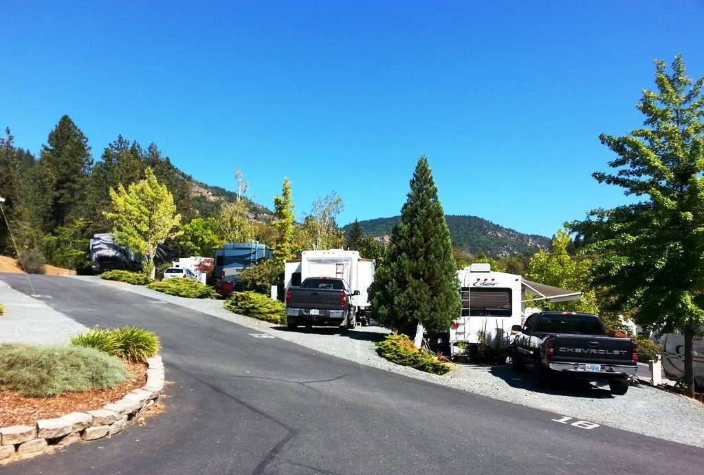 Moon Mountain RV Resort in Grants Pass Oregon is a year round park that offers 50 RV Sites with 24 pull through sites. The sites include full hook-ups, free Wi-Fi, extended cable package, 20/30/50 amp electrical service. Built on the side of a hill the sites are terraced along the grade. Paved roads with gravel pads the steep slope limits the park to fifth wheels and RVs capable of maneuvering over the bumps (super long rigs generally bottom out).