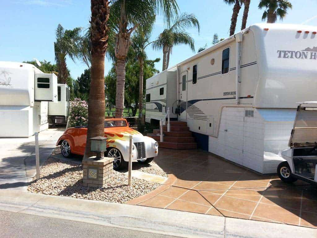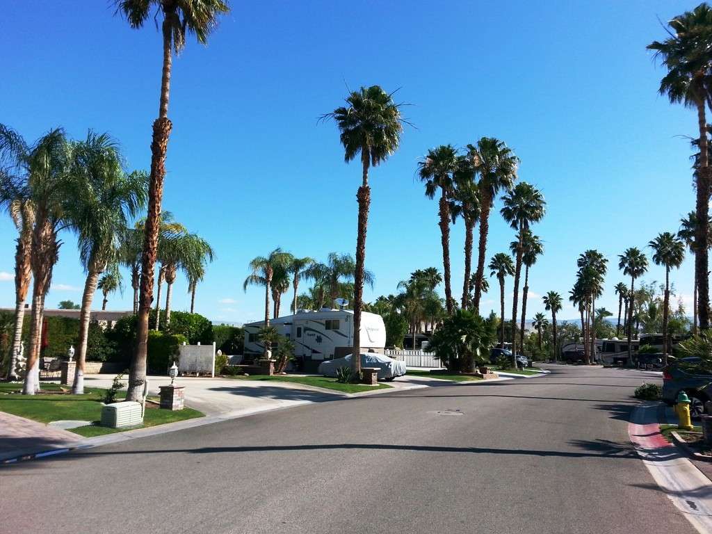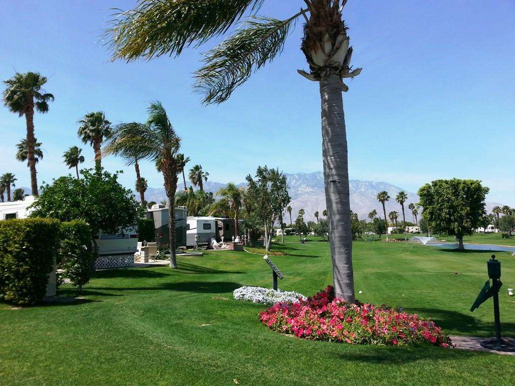 Outdoor Resort Palm Springs in Cathedral City California has 1213 full hookup RV spaces available for rental or sale. The high end resort features a gated entrance, two main clubhouses, 8 satellite pools, two main pools, a fitness center, 27 holes of golf, multiple laundries, scheduled events, tennis, and all the amenities you could possibly imagine in a super high end resort.