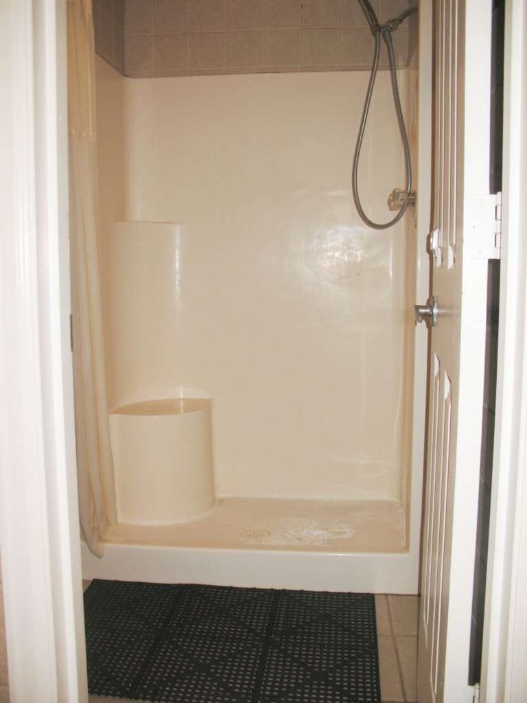 We were in the older section of park across bridge but still very neat and tidy. Obvious upgrades and remodel done with pedestal sinks and nice secure /private tiled showers/fiberglass stalls that were not cramped + changing area w/nice corner bench. Extra nice touch was rubber floor mats when you exit shower, + shelves w/hooks for all your stuff / same as at the sink area – wish all parks would have these. Paved roads, cement pads, good space between sites w/vegetation green-space that included picnic table w/plenty mature shade trees.