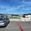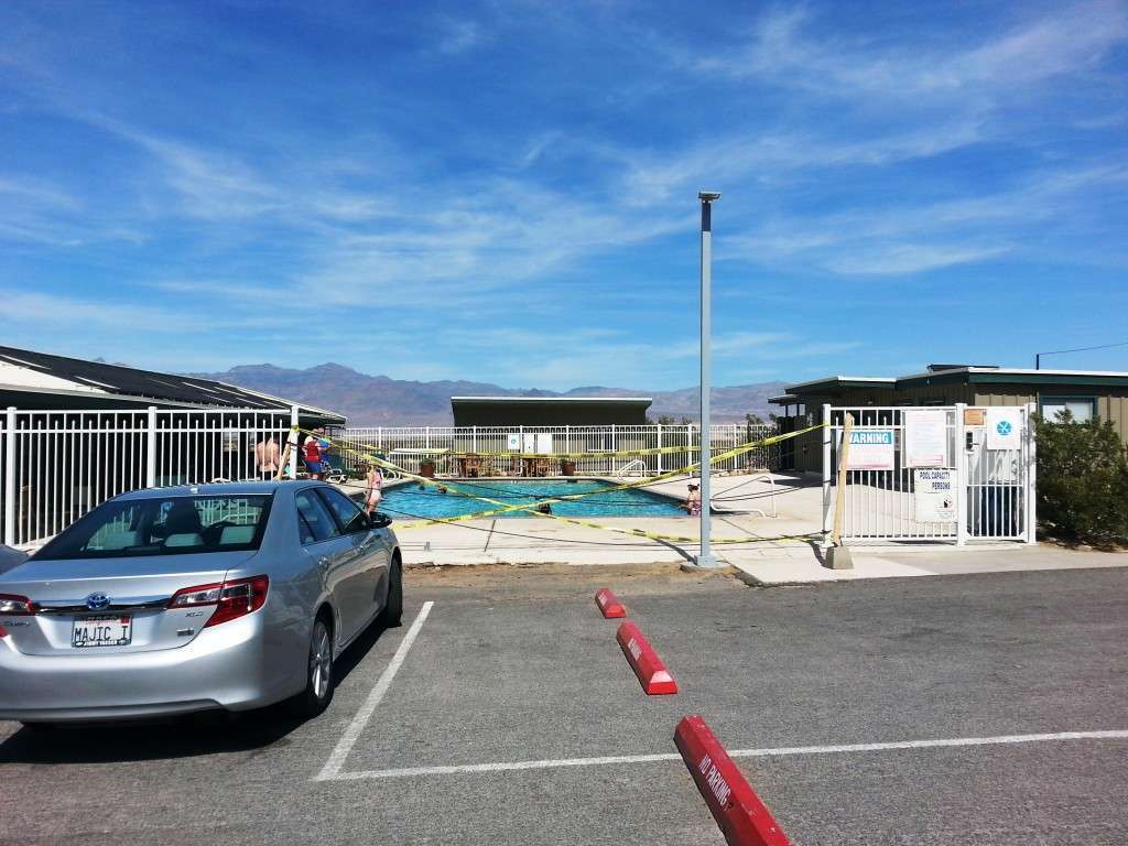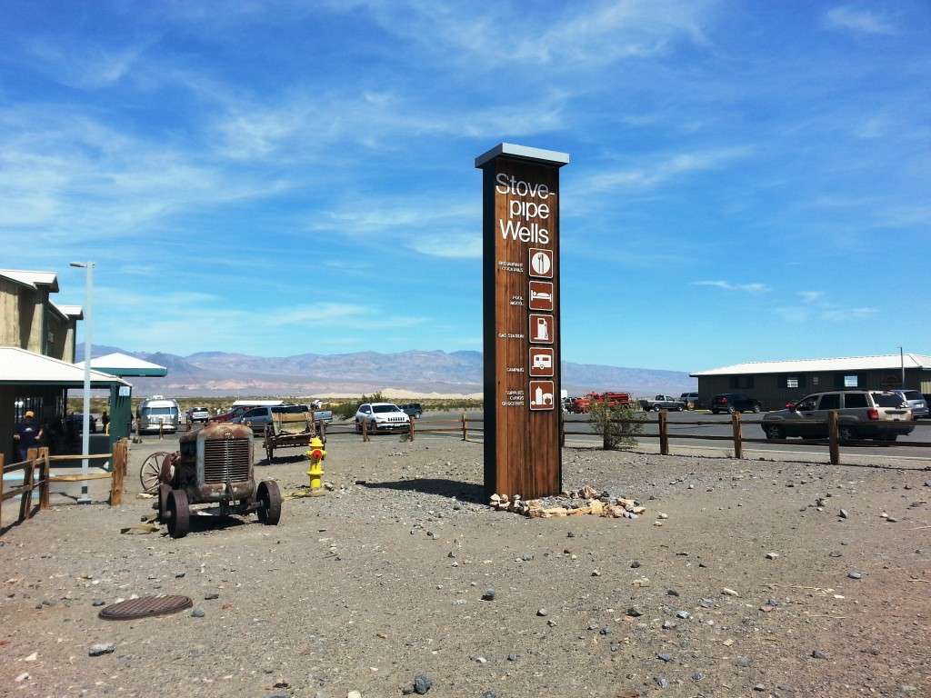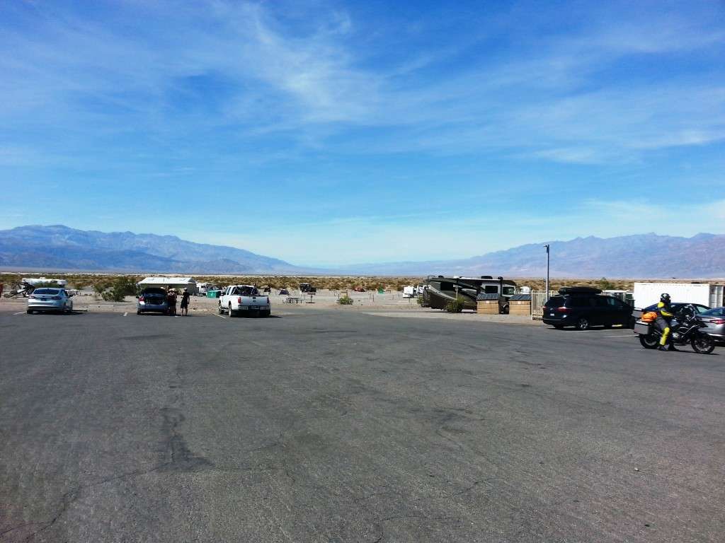 Stovepipe Wells RV Park in Death Valley National Park California is a private 14 site full hookup campground inside the National Park. Reservations recommended during peak season. The 14 sites are situated in one row just behind the service station/ gift shop just off the highway. RVs front windows face the NPS campground and scenic views looking northeast across Death Valley. Dirt roads and pads. Guests have access to the pool located in the hotel complex just across the highway.