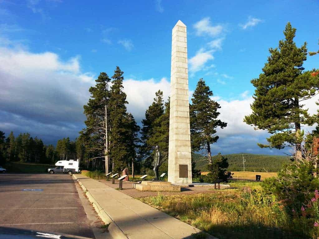 Summit Campground west of East Glacier Montana is located at the top of Marias Pass behind the Memorial Square commemorating Theodore Roosevelt and the Blackfeet tribe with a miniature Washington Monument (also a rest area along Highway 2). The forest service campground (Lewis and Clark National Forest) offers 17 primitive tent and RV campsites in a wooded setting. Water spigots, toilets, and a dump station are available. Two paved loop roads are easily accessed for most any size RV. A camphost is on site in season.