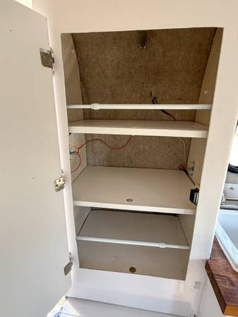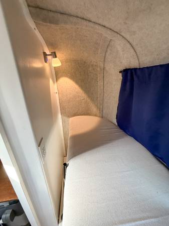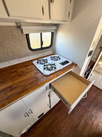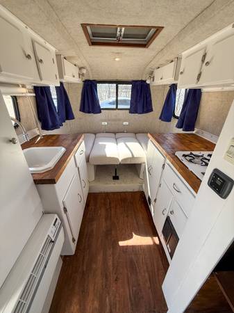 ✔ Cozy Meets Functional – Solid Acacia butcher block countertops, a slide-out 12V refrigerator, and an efficient new plumbing system make the kitchen space sleek and practical.